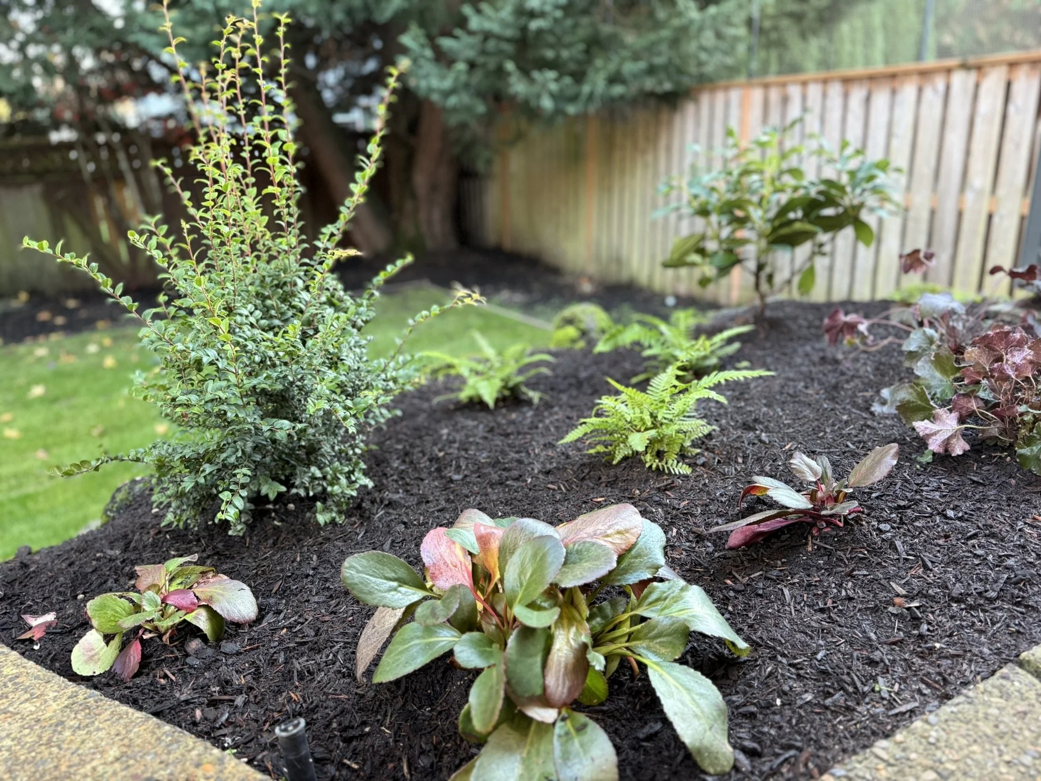 Two PNW natives — Evergreen Huckleberry and Sword Fern — were incorporated alongside ornamental plants. The client loves taking her coffee out on her patio, surrounded by these vibrant plantings.